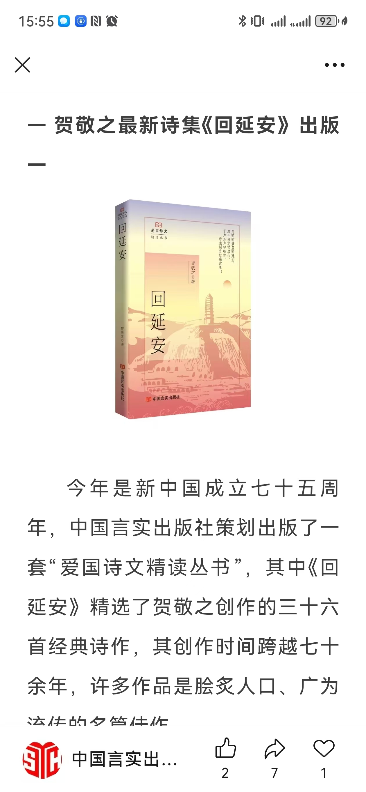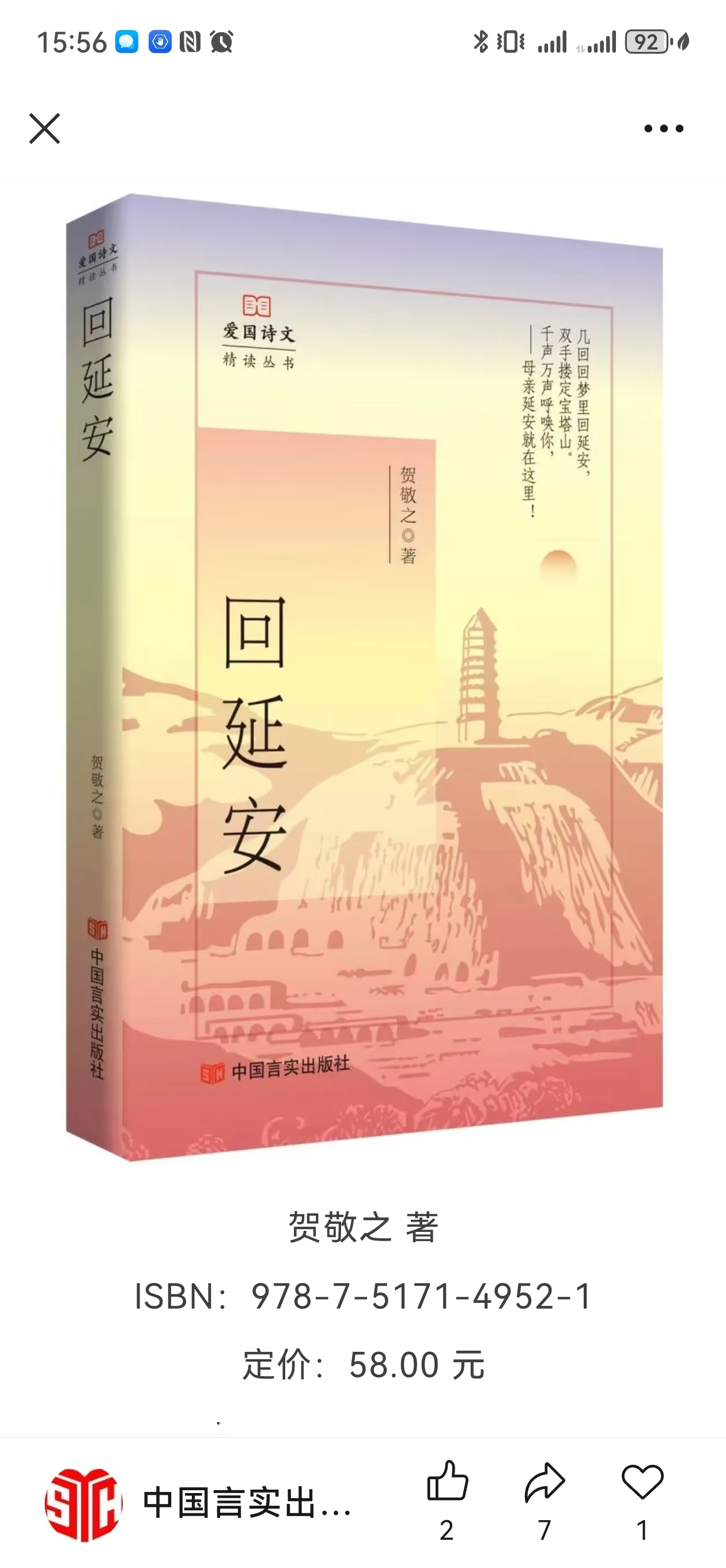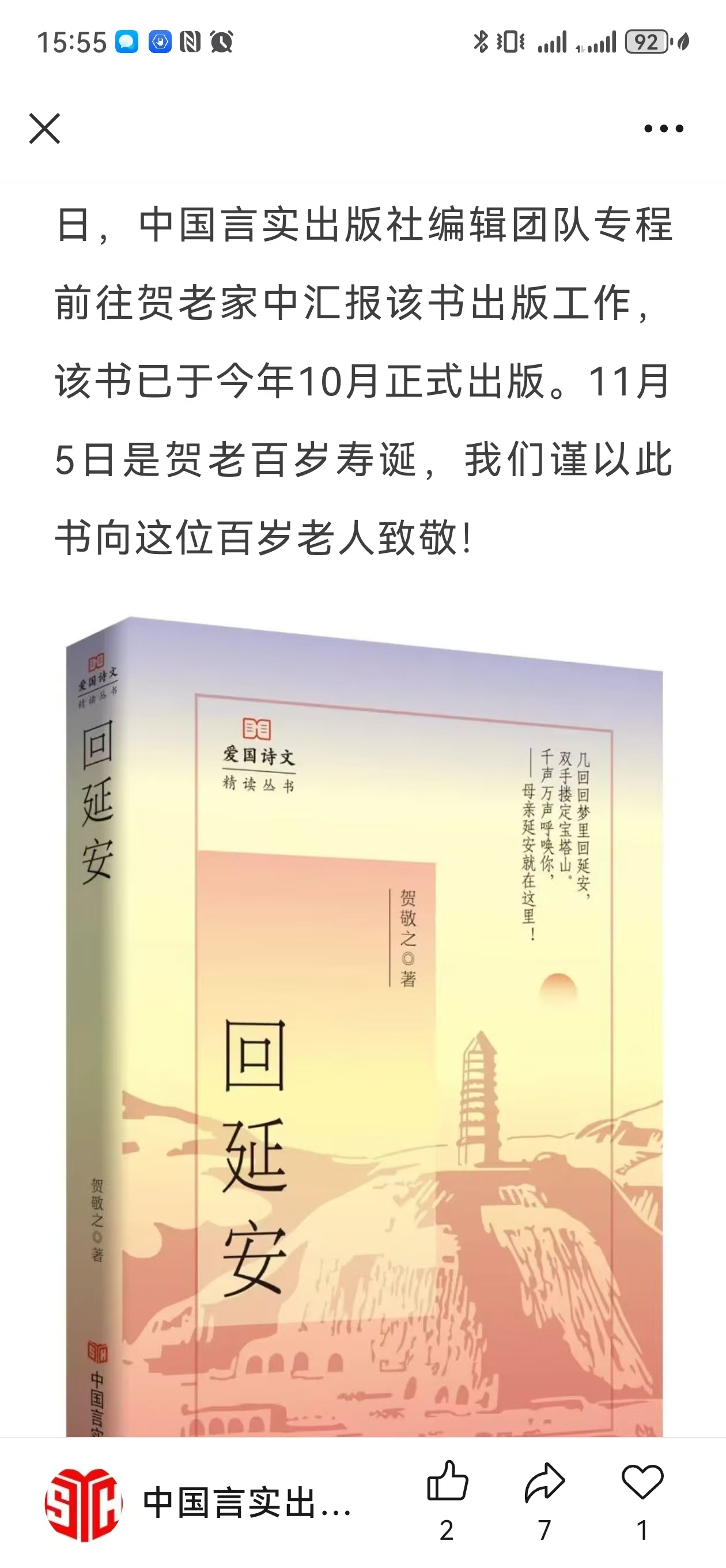 百岁寿星贺敬之的新诗集《回延安》出版啦!老诗人的作品曾影响几代青年人