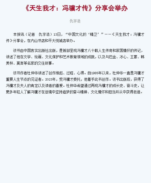 天津日报:《天生我才:冯骥才传》分享会举办